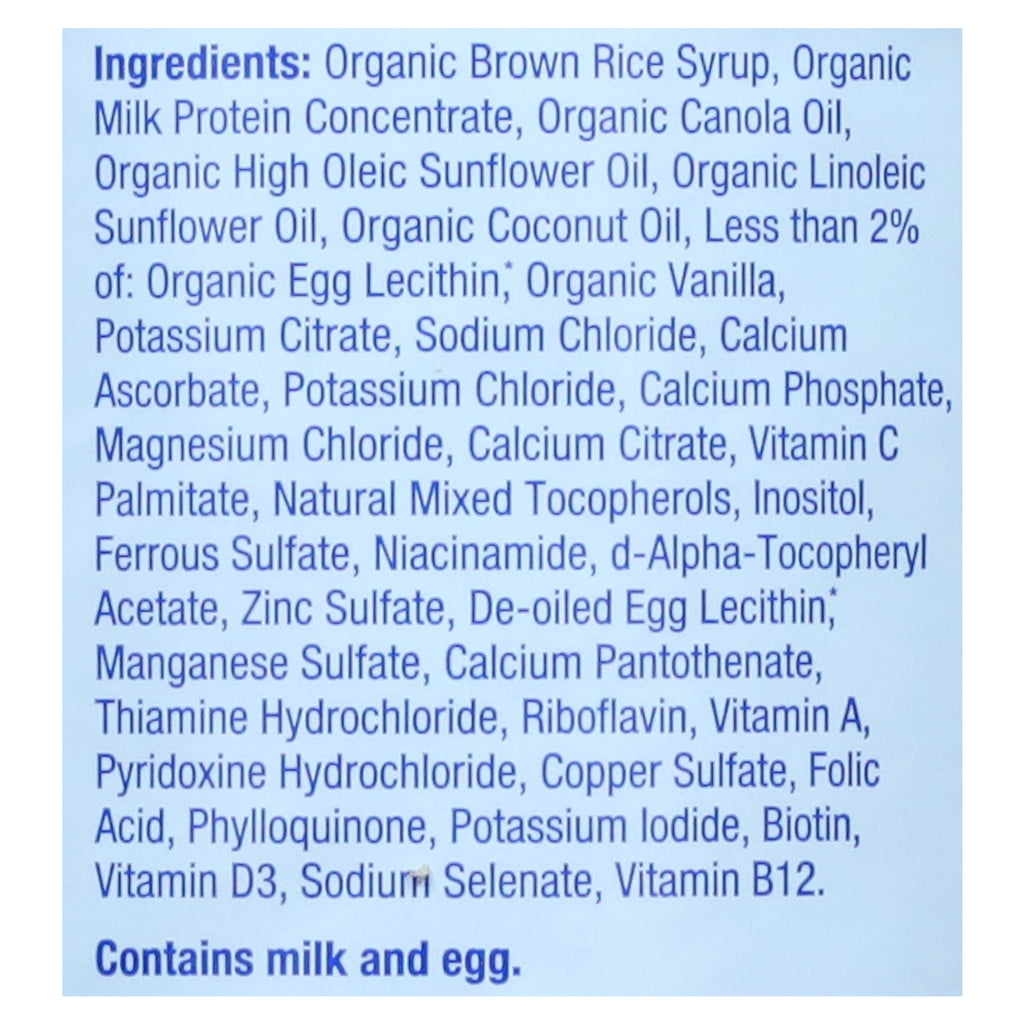 PRODUCT DETAILS: USDA Organic. Certified organic by Quality Assurance International. Organic DHA & ARA. Gluten free. No genetically modified organisms (ingredients not genetically engineered). Non-GMO (ingredients not genetically engineered). Quality standards. No prohibited pesticides. No corn syrup or palm oil. Est. in 1997. Parent trusted brand for 20 years. Organic DHA & ARA. Powder add water. Parent trusted brand for over two decades. Our toddler drink is meticulously crafted in small batches at our state-of-the-art facility in Ohio, to ensure that we never compromise on purity, safety, and quality. From our family to yours, thank you for choosing Baby's Only. Baby's Only Toddler Drink is intended for a child 1-year of age and older or when directed by a healthcare professional. Formulated to support lactose sensitivity. Ideal for toddlers with lactose sensitivities, our organic sensitive toddler drink features a recipe that uses American dairy, rather than soy, as its primary protein source. Made with love. Our never ever list: Baby's Only will never contain: Palm oil; corn syrup; prohibited pesticides; artificial color or sweeteners. Filled by weight, not volume. Some settling may occur. Best when used by stamped date on bottom of can. www.babysonly.com. More information: www.babyonly.com. info(at)babysonly.com. 1-800-227-7122. Developed in USA.