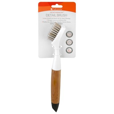 PRODUCT DETAILS: 2-in-1 brush and detail nib for deep cleaning. Scraper removes stubborn dirt. Perfect for sink drains, faucets, shower doors, appliance and edges. Safe for your non-toxic. Responsible living. Sustainable choice. A Micro Manager never misses a detail, whether it be lurking around your sink drain, your faucet or even on kitchen appliances. Take two-in-one tool features a flexible pointed nib for removing hidden gunk, and a scrub brush that keeps your kitchen and bathroom sparkling. Intentional Design: Two products-in-one scrub brush & crevice tool. www.fullcirclehome.com. Learn more about our products at fullcirclehome.com. Certified B Corporation. Earth friendly. Materials. BPA Free. Earth friendly materials. Bamboo, recycle plastic. Responsible Living: Durable, recycled materials. Responsibly made in China.